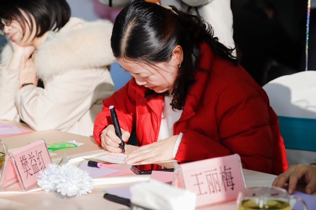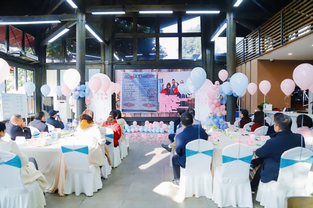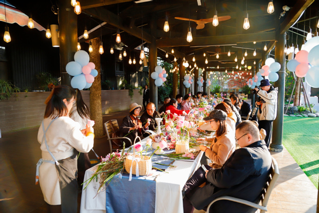 “同心插花”环节延续温馨氛围。花艺师现场解读花意,粉玫瑰寄托爱意绵长,尤加利叶象征默默守护。银婚夫妻们默契分工,剪茎、造型、轻声交流,将对彼此的心意融入花束之中,搭配浪漫卡片的插花作品,成为承载时光与爱意的独特纪念。在摄影打卡点,夫妻们或捧花相望、或重现老照片姿势、或并肩低语,摄影师用镜头定格下一幕幕温情瞬间,留住二十五年相守的美好。